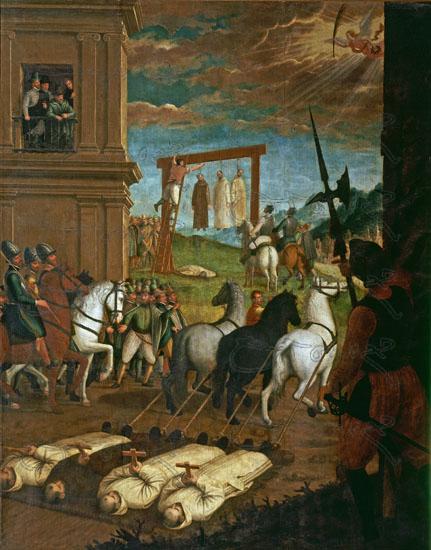 SORPRENDE la colección de lúgubres pinturas de fray Juan Sánchez Cotán (1560-1627) que se encuentra en el monasterio de La Cartuja de Granada. Se trata de escenas bastante naturalistas, que distan mucho del barroco andaluz, acaso porque se deben por entero a las escenas históricas que representan y que tratan, primero, de la vida de San Bruno y, segundo, de la inquisición anglicana que sufren los priores cartujos en Inglaterra —aunque de la Inquisición anglicana no se sabe mucho, puesto que los spin doctors ingleses dominan y se encargan de que la leyenda negra solo ponga en evidencia a Torquemada y sus muchachos.«Tres priores de los cartujos y el fraile de Santa Brígida comparecen ante Lord Cromwell», es una de las pinturas de la colección. Muestra a Oliver Cromwell (Lord Cronwel, indica la cédula) sentado en una silla a la manera de un monarca y con idéntico ademán juzgando a los priores. El poder detrás del poder de la breve República Parlamentaria inglesa condena a todos a muerte, no sin antes someterlos a diversas torturas muy del gusto de la policía política de la época. Se les amarra al tiro de tres caballos y los priores, de espalda, vistiendo el hábito monacal blanco que caracteriza a esta orden de modestos frailes, son acarreados como animales por el suelo mientras sostienen sendas cruces en las manos atadas («Suplicio y muerte de los tres priores cartujos y el fraile de Santa Brígida», que se reproduce en la fotografía). Suponemos que el fraile de Santa Brígida viste de oscuro, como franciscano. Tanto blanco como marrón o gris son señas del voto de pobreza de esta orden. Nótese que los cartujos en España llevaron durante un buen tiempo la capa española.